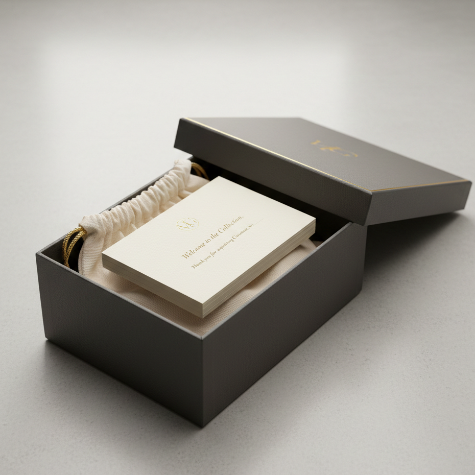 Acquisition is only the beginning. Every curation from the Gallerie arrives in our signature matte charcoal housing, accompanied by a hand-marked certificate of authenticity and a protective cotton storage bag. We believe the unboxing of a masterpiece should be as memorable as the first time it is worn.